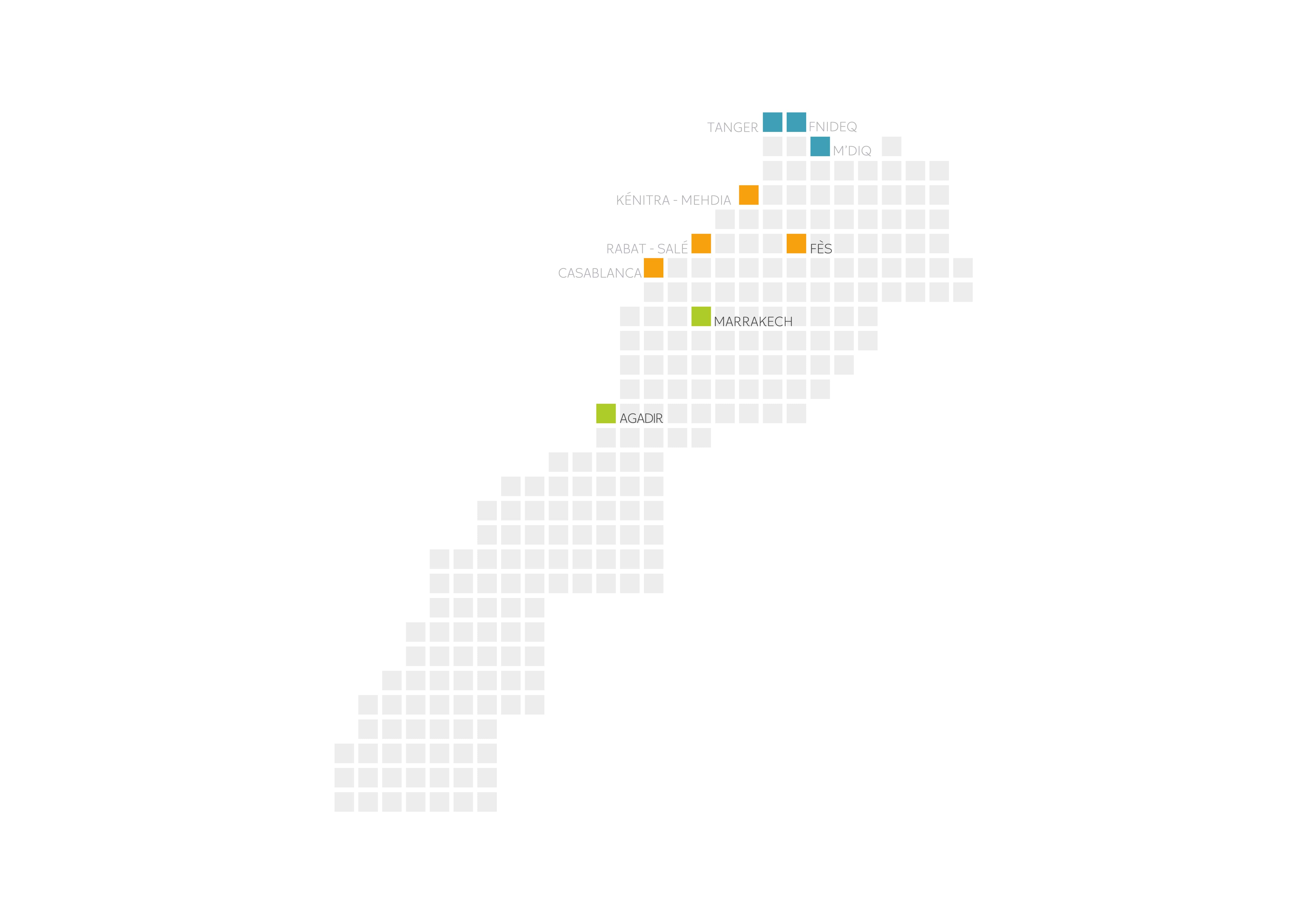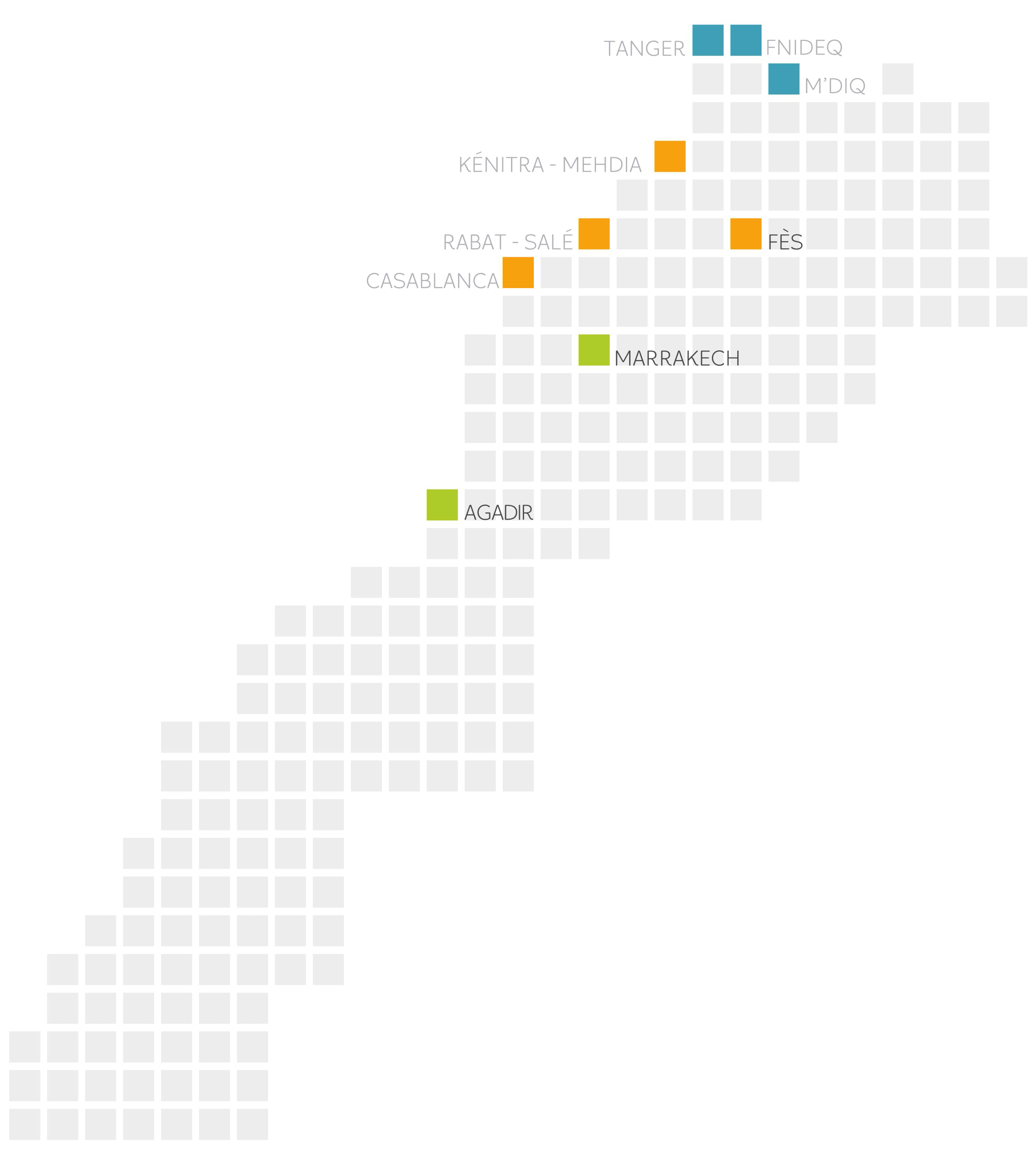 Aujourd’hui une vingtaine programmes sont en cours de construction ou totalement achevés et livrés, permettant ainsi une large couverture du territoire national : Casablanca (10 projets), M’diq, Fnideq, Tanger, Kénitra, Fès, Marrakech, Ain Aouda et Sidi Allal el Behraoui.
